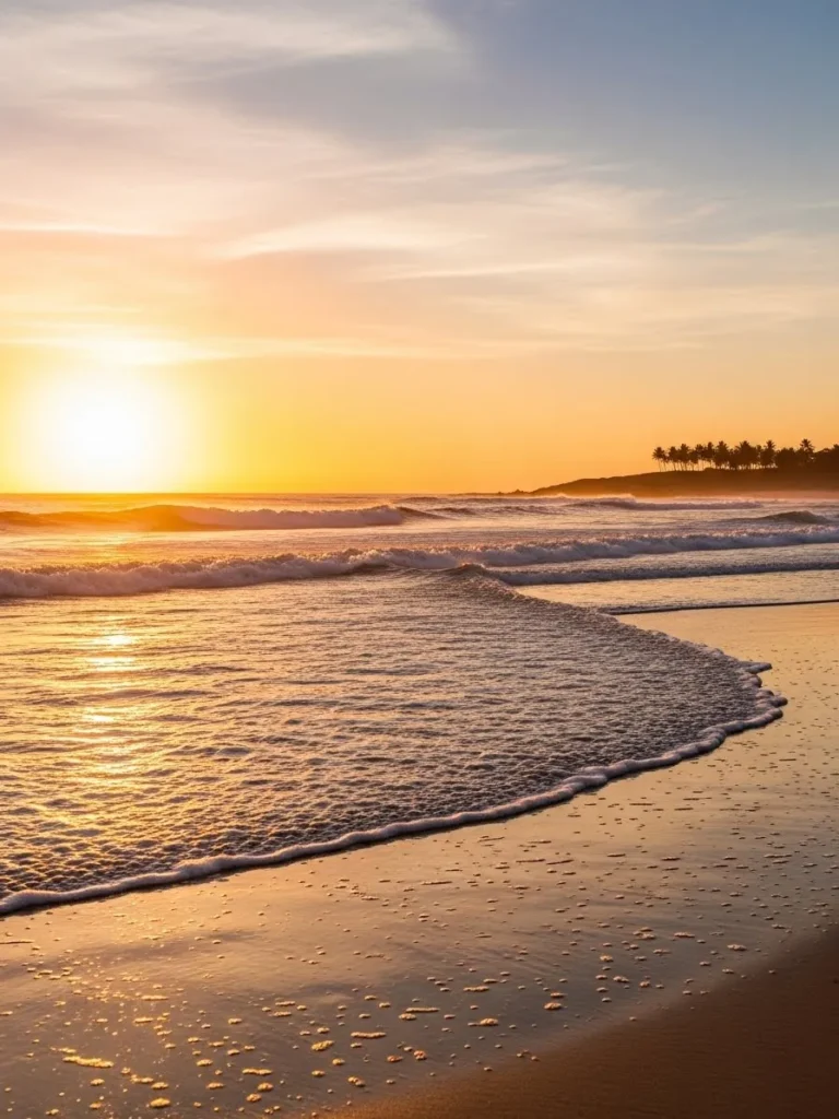 The rhythmic sound of ocean waves offers a sense of peace and grounding. This serene iPhone wallpaper captures the calmness of the waves as they meet the shore at sunset, bathing the sky in golden hues.