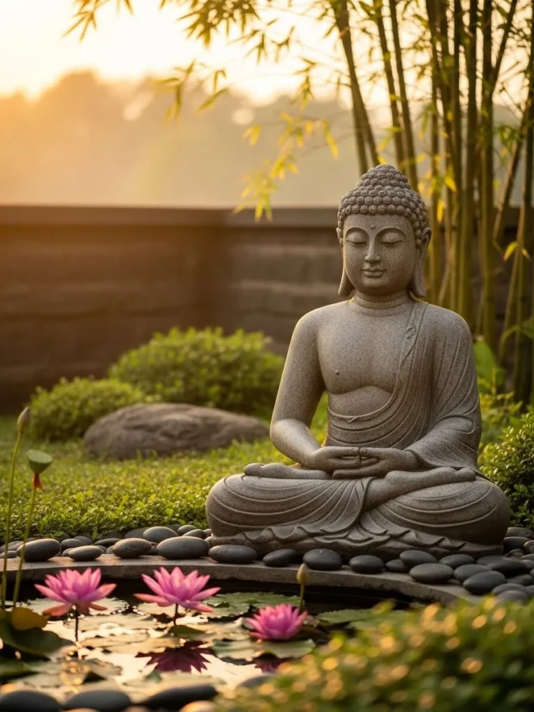 The image of a golden Buddha sitting in meditation exudes peace and serenity. This wallpaper, featuring a Buddha statue surrounded by lush plants and gentle sunlight, serves as a visual reminder to stay grounded in the present moment.