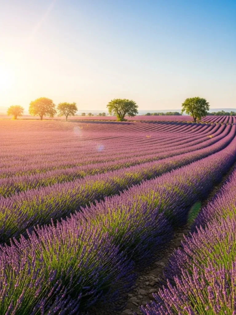 Lavender is often associated with calmness, relaxation, and healing. This peaceful wallpaper captures a field of lavender in full bloom, stretching towards the horizon under a clear blue sky.