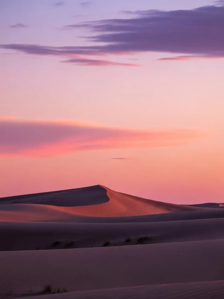 Desert landscapes evoke feelings of solitude and reflection. This wallpaper features a peaceful desert scene at dusk, with soft pinks and purples in the sky and quiet sand dunes stretching as far as the eye can see.